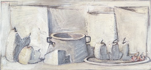 雷米·艾融REMY ARON的静物画作品《大锅》,画面结构是经过画家精心地思考和设计,静物的摆放与背景形成了对比关系,看似随意实则具有一定的空间感和立体感,从而使画面更加耐看。画面中的锅随着画家的主观愿望与盘中的水果平行而放,他的目的是将水果凸显给观众,以免使其孤立,雷米•艾融REMY ARON朝着平面化的方向又迈进了一步。整个画面采用冷色调,餐盘中的一抹红色和冷色调取得和谐却又不显得刺眼,对整个画面色彩关系的建立,起到了重要的作用。