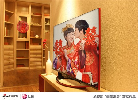 在此次由LG电子赞助的新浪家居“最美婚房”活动中,主打产品“观韵”电视获得了众多新婚夫妻的喜爱。“观韵”系列3D智能电视是LG电子在2013年推出的新品,分为红色LA6800及金色LA8800两款。“观韵”电视能成为众多新人婚房电视首选,其原因首先源于电视出色的外观设计。LG“观韵”电视设计上参考了中国传统的“船”形设计,打造富有艺术感的流线型电视底座,并与屏幕下方水滴状设计配合构成 “聚水入盆”形状,旨在为新婚夫妇带来寓意“一帆风顺”的美好祝愿。而红色和金色在中国自古便象征着“吉祥”与“富贵”,与婚房中其他寓意幸福喜庆的摆设相得益彰,将婚房氛围烘托的更为甜蜜舒适。