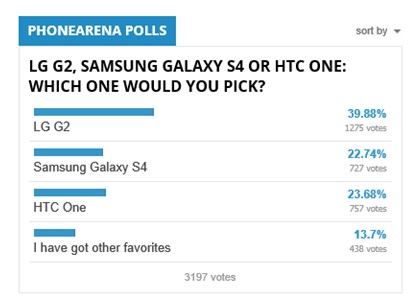 面对众多的智能手机,哪一款产品才是他们的第一选择?来看看phonearena.com网站给出的一组数据,在3197份抽样调查数据中,LG G2凭借1275的票数遥遥领先。虽然仅仅上市几天时间,但看来G2已经在海外市场中获得了消费者的高度认可。