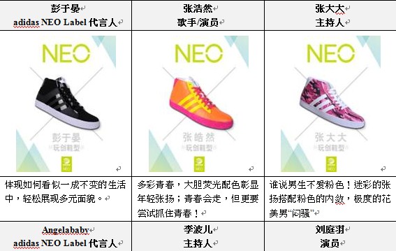 [2013年9月9日]自由行 乐无沿-走出充满创意与乐趣的旅程,就从脚下的NEO鞋型开始!adidas NEO Label 2013年秋冬品牌活动再次向全国年轻朋友们发出邀请,于9月9日起推出「玩创鞋型 掌控NEO舞台」网路活动,邀请所有粉丝将NEO鞋款当做实现创意的画布,设计充满个人风格的NEO球鞋造型,最终adidas NEO Label将挑选前10名最具個人风格的玩家作品,与彭于晏和Angelababy共同登上于10月中在北京举办的「玩创鞋型」秋冬时装秀舞台!