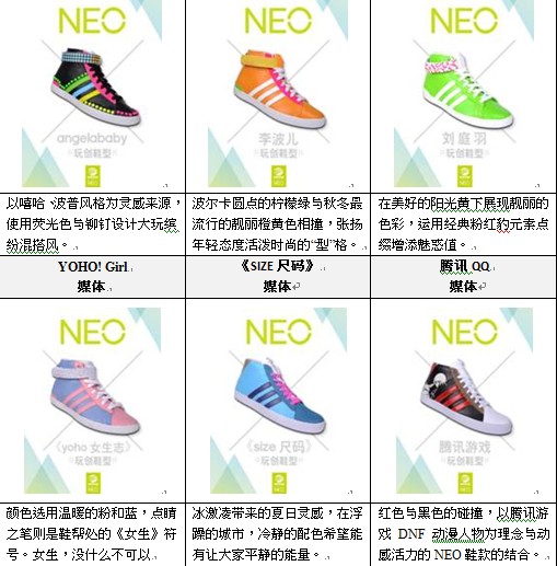两位品牌代言人除了在NEO秋冬品牌大片中穿上经典绒面革蓝/红BB NEO高帮鞋,呈现亮眼的运动休闲风格,在「玩创鞋型 掌控NEO舞台」活动之初,也率先设计两款最能体现个人风格的BB NEO鞋款,号召所有粉丝一起拼设计!彭于晏以单一色调混搭多元材质呈现生活體驗:”NEO精神对我而言就是透过不断地探索,持续发掘平凡生活中的乐趣.我的全黑NEO鞋款看似简单,仔细玩味就会发现许多令人惊喜的细节!”有别于彭于晏的低调內斂,Angelababy则大玩色彩游戏:”对女孩子而言,一双出跳的鞋绝对是整体造型的亮点.我的NEO鞋款以最喜欢的嘻哈风/摇滚乐为灵感,又酷又型更抢眼!很高兴有机会能发挥想像力与大家分享我心中最正的NEO球鞋造型!”此外adidas NEO Label也邀约媒体代表与潮流玩家同步响应,用创意为本次活动注入新血!
