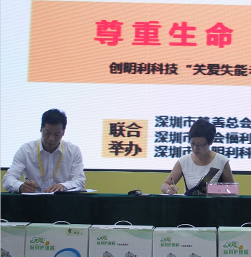 会上,深圳爱心企业创明利科技有限公司总经理靳平安首先发表致辞,对今天参加“关爱失能老人”公益项目签约仪式的各位领导、公益组织、慈善机构、社会各界爱心人士和新闻媒体表示衷心感谢。指出,据《中国老龄事业发展报告(2013)》显示,失能老年人口继续增加,2012年已达3600万人,2013年将增长到3750万人。基于这个社会问题,专注致力于开发各类失能护理产品的创明利科技有限公司,在企业自身发展的同时,也在积极参与社会公益事业,先后向民政部门、经济困难的家庭、雅安地震灾区捐赠产品达上百套。另外,公司还推出了一个“失能人群特困家庭百万援助计划”,企业计划在两年内无偿提供价值100万元的失能护理器产品,援助那些因疾病、事故、残疾等造成大小便不能自理或长期卧床不起、需要常年照料和护理人群的困难家庭,进一步体现“关注民生、尊重生命、传承爱心、用于担责”的企业精神。