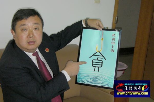 白小林向记者介绍:漫画(上图)是由金色鱼钩、大篆体“贪”字和蓝色的波纹组成。借用比喻的手法,以形似鱼形的大篆体“贪”字代表贪婪的鱼儿,金色的鱼钩代表各种利益的诱惑,禁不起利益的诱惑就逃脱不了被钓起的命运。警示人们面对诱惑要经得起考验,不要有贪婪之心,否则终将受到应有的惩罚。