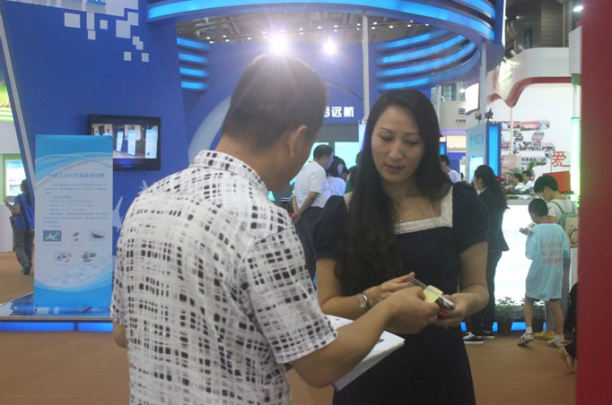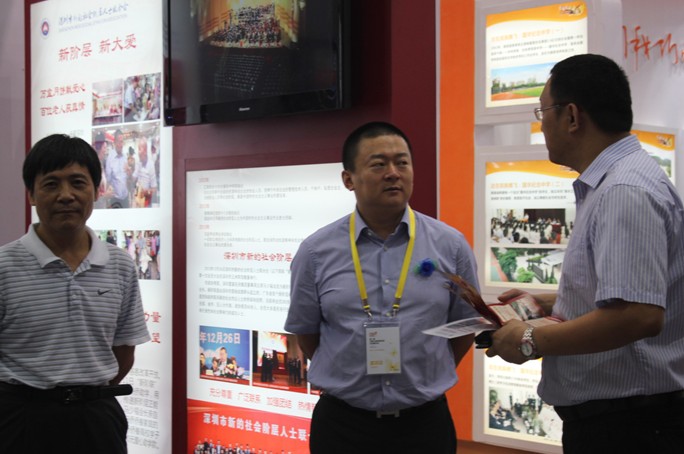 图一:深圳市新的社会阶层联合会会长马少福(中)在展位现场答疑
