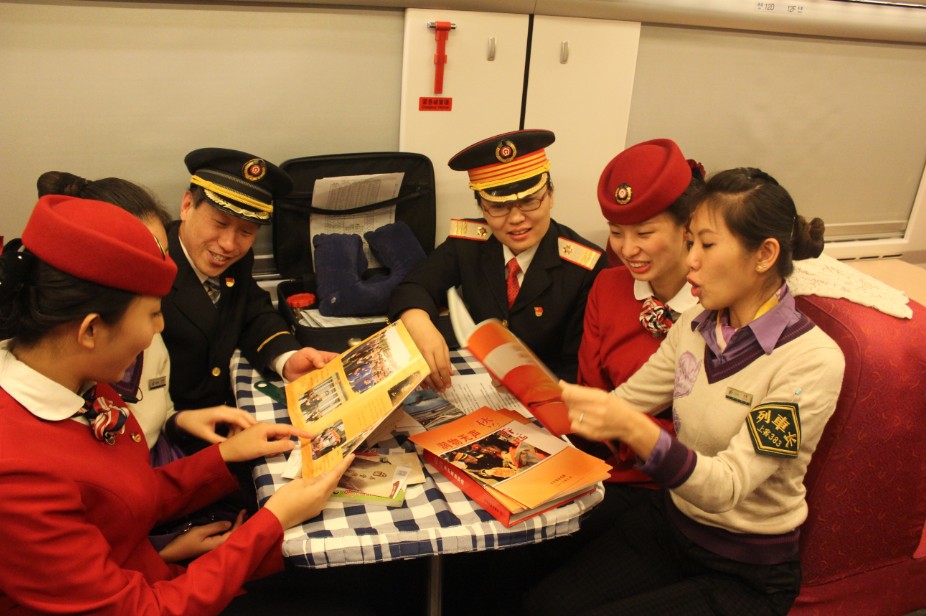 北京南站润秋服务组和上海客运段人员一起与外国游客交流沟通