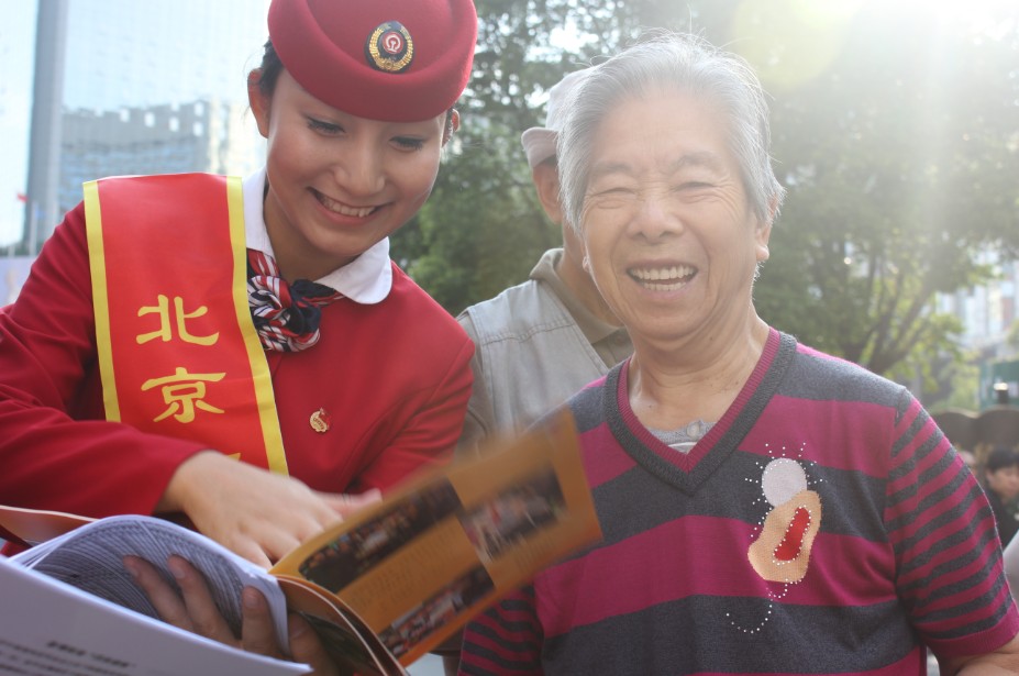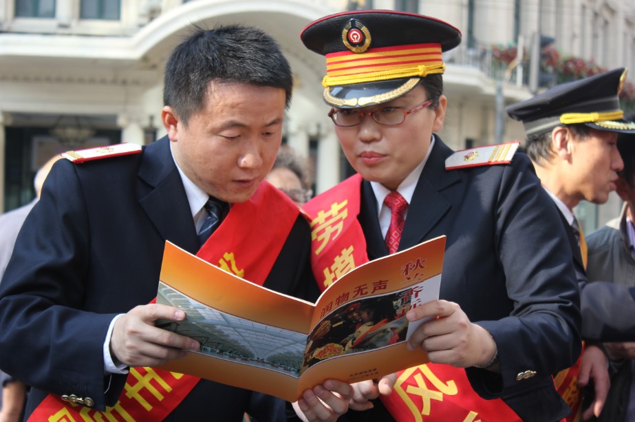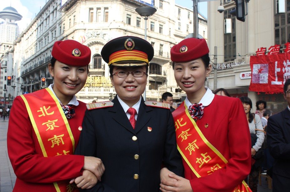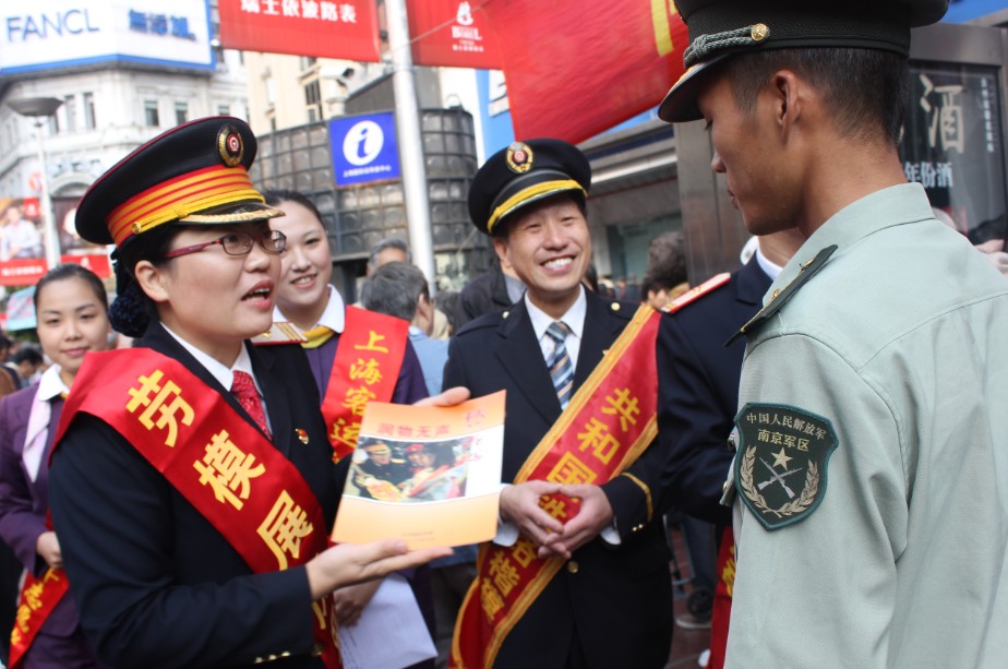 全国劳模张润秋在上海南京路为人民服务现场向南京路上好八连发送北京南站宣传册