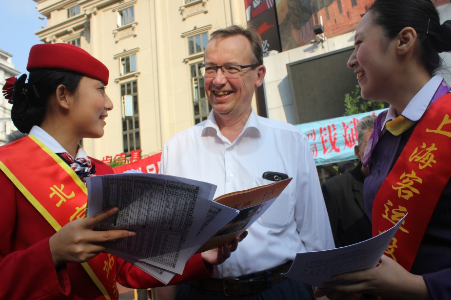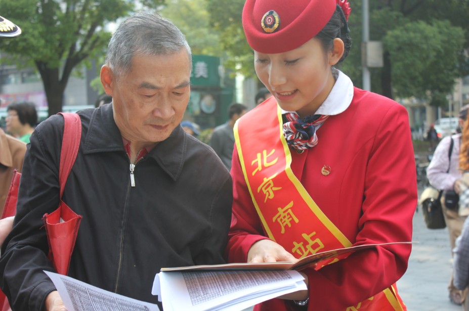 北京南站润秋服务组成员邢艺冰在上海南京路为人民服务现场向外地游客宣传北京南站爱心服务法