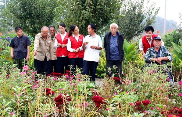 在敬老院院内花园,共产党员服务队员和六、七个老人们在鲜花丛中漫步,并不时传来说笑声。