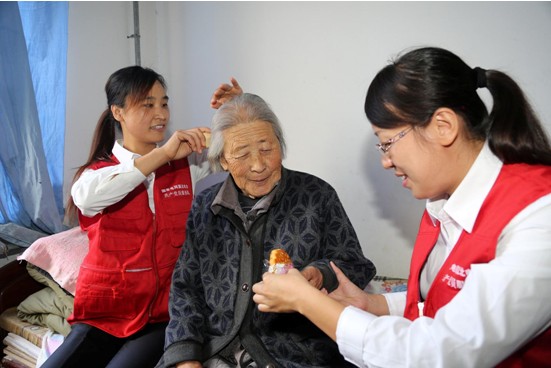 “大娘,您多大岁数了,身体还好吧?在这里住着舒服吗?”在王大娘的寝室了,共产党员服务队队员小孔坐在王大娘跟前,陪老人聊天。同时,另一名共产党员服务队队员小张为老人梳头。