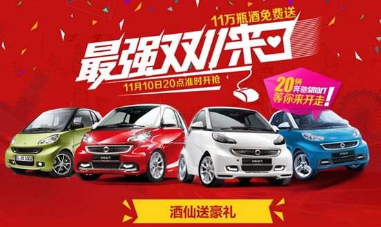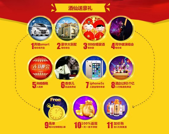11月6日消息,酒仙网史上最强购物狂欢将在11月10日晚上8点正式启幕。酒仙网双十一大促,联合了包括茅台、五粮液、剑南春等在内的近百家知名酒企,超大阵容免费送出11万瓶酒水。此外,各酒企还纷纷推出新招助力酒仙网双十一,厚工坊准备的礼品是豪华海景房别墅、苍井空签名酒,杜康则提供了20辆奔驰smart,法国香奈送channel包包、channel香水,泸州老窖和宋河则分别准备了周华健演唱会门票和马年春晚门票,孔府家为光棍节即将脱光的新人们准备了1111份的婚宴酒豪礼,酱领则为大家献上苹果5s土豪金等,堪称史上最大规模的“豪礼”大派送。