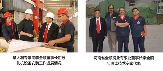 全顺铜业作为国内第一家全面引进世界各国一流设备的企业,在设备安装、调试阶段聘请了来自美国、德国、瑞士、意大利等世界级高级项目工程师到设备安装现场指导工作。国际友人的全力协助,为设备安装的顺利进行提供了有力保障。他们严把细节关,对工作要求精益求精,小到一个螺丝钉的松紧度都要严格审核。外国工程师在与中国六冶安装队、公司项目工程师、技术人员的通力配合下,设备安装按照项目排期顺利进展。瑞士高级工程师MOSE曾多次指导安装调试高精压延铜箔设备,他在接受记者采访时说:“很高兴来到中国,和中国的工程技术团队合作感到无比的开心。中国作为世界上最大的发展中国家,科技学习和创新能力令人钦佩,我指导过不少国家的设备安装调试,中国人的独立思考和创新能力让我尤为惊叹,有时他们可以独立完成部分设备安装工作。和这样优秀的团队合作,使得工作得心应手。”