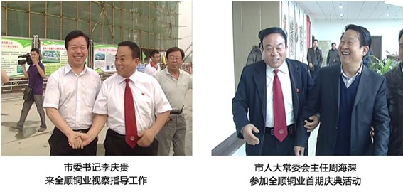 卫滨区工业集聚区是新乡市重点产业园区,地理位置优越,交通体系四通八达,全顺铜业就坐落于此。在市委、市政府、区委、区政府的高度重视和大力扶持下,全顺铜业极力引进高精压延铜箔生产项目。自2010年至今,新乡市市委书记李庆贵、原书记吴天君带领领导班子多次莅临河南省全顺铜业有限公司视察、指导工作。建厂之初,水电的供应成为公司面临亟待解决的首要问题,在政府的积极协调下,由政府出资,供电局施工全力为公司架设电缆,与此同时,水利局为公司修设供水管道,仅一个月时间,公司面临的水电问题迎刃而解。政府领导强调:高科技电子行业的发展使国内对压延铜箔的需求与日剧增,发展国内压延铜箔生产、代替进口是非常有必要的。政府非常关注全顺铜业此项目的建设,为实现早日打破国外高精压延铜箔技术垄断,填补国内空白营造优质的营商环境,把全顺铜业作为新乡市政府的重点扶持企业。同时希望全顺铜业早日和兄弟企业金龙铜业一起把新乡市建设成为中国重点铜加工基地,为新乡市、为河南省,为国家经济建设做贡献。