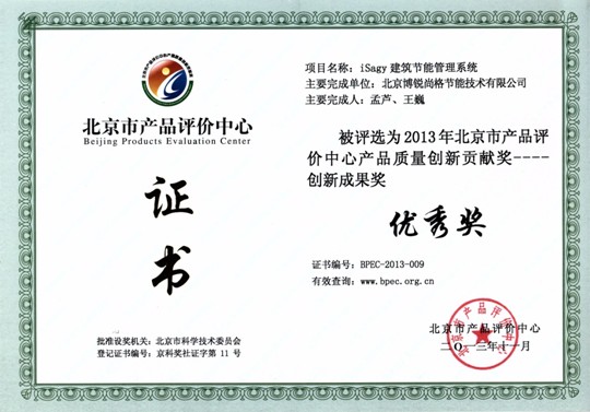 近日,由北京市产品评价中心承办的“2013年第三届北京市企业品牌建设推进大会”在北京腾达大厦隆重召开。国家质检总局原副局长、原中国质量检验协会会长、北京企业评价协会名誉理事长李保国,中国产学研品牌建设联盟理事长解艾兰等各界企业代表150余人出席了本次推进大会。作为国内建筑节能专家,北京博锐尚格节能技术有限公司受邀出席,其核心产品“iSagy建筑节能管理系统”被评为“2013年北京市产品评价中心产品质量创新贡献奖——创新成果奖”。