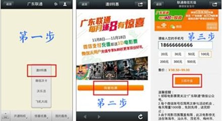 自即日起至11月18日,微信用户只需要关注“广东联通”微信公众号,点击菜单栏的“惊喜优惠”→“逢8特惠”即可进入活动页面,通过微信支付功能充值,即可以获赠免费电影票。
