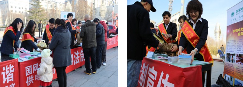 上午8点,宣传人员在政府广场前通过设立宣传台,悬挂宣传横幅,摆设宣传展板,发放宣传单、电力安全知识扑克、纪念购物袋、现场咨询等形式扩大法制宣传的影响,在全县营造良好的宣传氛围。为了让人民群众全方面的了解电力法律法规,特别是一些与百姓切身相关的问题。宣传人员准备了包括《电力法》、《电力设施保护条例》、《反窃电问答手册》以及与之相关的《严禁在电力线路保护区内违法作业》、《安全用电知识手册》、《节约用电宣传材料》等十余种法律法规及安全用电材料。涉及范围包括依法用电、安全用电、节约用电等多个方面,不仅有条理清晰的规章制度,还有生动形象的画册图片,内容丰富而广泛。每发一份宣传材料,宣传人员都向群众进行详细的讲解说明,并对相关的电力专业术语、定语进行了翻译解释。而且,针对百姓关心的阶梯电价、违约用电、业扩报装、装表接电等热点问题,公司宣传人员还做了单独的讲解,消除了人民群众对电力的认识误区。