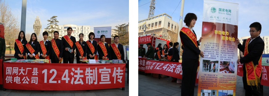 12月4日,围绕“弘扬法治精神、共筑伟大中国梦”的宣传主题,国网冀北大厂县供电有限公司由办公室、客户服务中心等相关单位组成宣传小组在县政府广场前举行“12•4”全国法制宣传日宣传活动。通过活动的开展,树立了公司良好的企业形象,进一步为公司的科学发展,创造良好的法治环境,构筑和谐电力打下了坚实的基础。公司党委书记、工会主席参加宣传活动。
