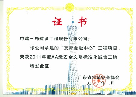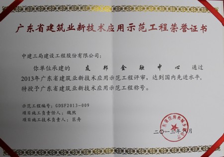 友邦金融中心项目于2011年申请广东省建筑业新技术应用示范工程,并成功立项。2013年7月31日,广东省住房和城乡建设厅会同其他建设主管部门和协会组成专家组,对中建三局建设工程股份有限公司申报立项的广东省建筑业新技术应用示范工程“友邦金融中心工程”进行了评审验收。