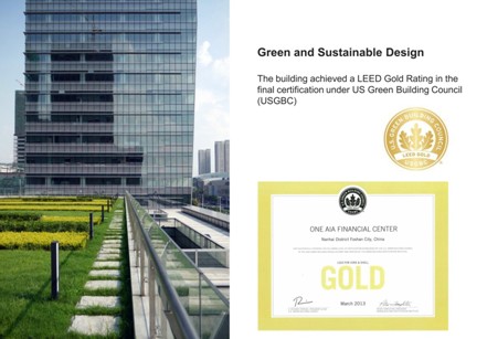 生态、节能、高效著称的LEED建筑设计以及建筑施工过程的绿色施工理念和实施使该建筑一举获得国际LEED认证金奖。使该建筑成为佛山市首个获国际LEED环保认证的纯商务甲级写字楼,也成为广东省金融高新区的标杆商务大厦。