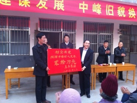 2013年12月2日,阜丰集团董事长李学纯一行来到山东省莒南县涝坡镇中峰村,参加村企共建暨捐助活动。李学纯董事长再次个人出资捐款20万元帮助中峰村改善村容村貌,在寒冬里为广大村民送来了暖暖春意。莒南县委常委、组织部部长吴广江、涝坡镇党委、政府等领导及有关人员出席了此次活动。