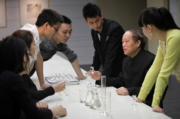 国家级非物质文化遗产“水井坊酒传统酿造技艺”代表性传承人——赖登燡品酒(右二)
