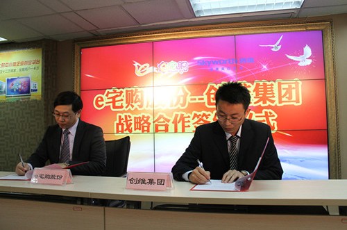仪式上,e宅购董事长兼CEO谭远程、创维商用显示部副总裁党文宝先生登台,正式签署战略合作协议,预示创维集团正式成为e宅购第二代微媒体创富机的硬件定制合作伙伴。