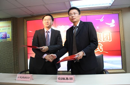 e宅购董事长兼CEO谭远程(左)、创维商用显示部副总裁党文宝先生(右)正式签署战略合作协议