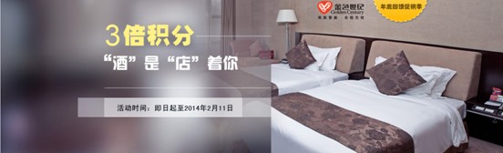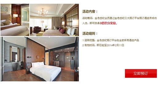 快来金色世纪吧!金色世纪近期特别推出“年底回馈促销季之3倍积分‘酒’是‘店’着你”活动。即日起至2014年2月11日,只要通过金色世纪预订并成功入住酒店,就可获得3倍积分奖励。无限额积分赠送,订的多,送得多!