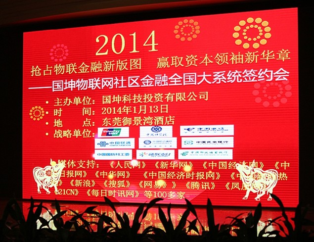 2014年1月13日,广东国坤物联网社区金融全国大系统签约会在东莞御景湾酒店“火爆”进行。中国银联、东莞多家银行负责人——交通银行、南粤银行、招商银行、邮政储蓄银行、广发银行、华夏银行等金融大腕,及来自全国各地客商、嘉宾150余人参会。甘肃、宁夏、福建、湖北、深圳、广州、东莞、银川、武汉等9大省、市现场签约,其中深圳更是引发多人“追逐”。