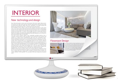 2014年,LG中国设计中心联合清华大学,重磅推出了主打中国传统文化的牡丹纹显示器新品MP56HC,其以牡丹纹的青花瓷外观,搭配LG独有的IPS硬屏,并配备了护眼模式、健康不闪屏技术和出厂前硬件校色等一系列的功能或附加值。牡丹纹显示器MP56HC有23.8英寸和21.5英寸两种尺寸的机型,屏幕拥有5,000,000:1的业内最高动态对比度,最大分辨率为 1920×1080,支持D-sub和HDMI接口。