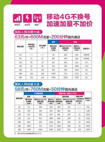 4G商用套餐体系月费门槛降低至58元,与3G相比加速加量不加价