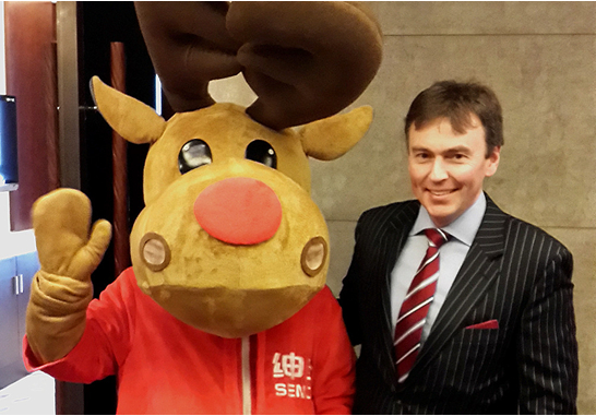 世界台球联合会主席杰森•弗格森和绅宝麋鹿人偶合影
