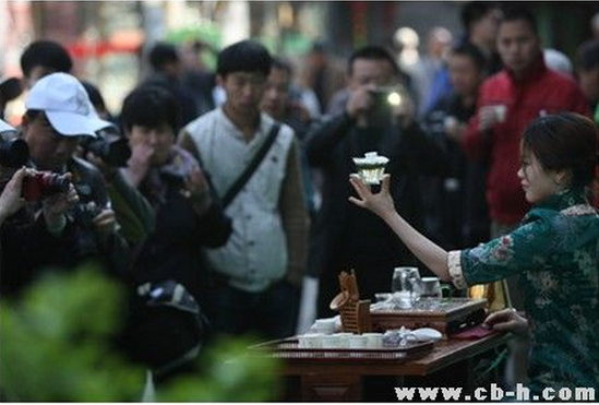 活动当天,张一元总店门口表演的“南北茶艺现场秀”,吸引了不少爱茶人士驻足观看。来自张一元四川峨眉山和浙江景宁畲族自治区绿色生产基地的高级茶艺师们,身着特色茶服,和张一元“世博茶仙子”同场竞技,现场展示南北茶道各自的精妙和魅力。