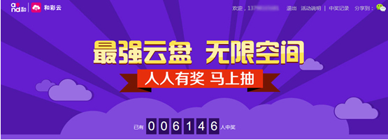 据悉,此次主题为“最强云盘、无限空间”的活动是和彩云全力满足全国用户对云盘空间强烈需求而开展的一次大型线上活动。该活动举办时间为2014年4月2日-6月2日。活动期间,用户只需登录活动页面即可参与抽奖,每位用户每天有一次抽奖的机会且当天有效。抽中50T空间的用户当天成功登陆和彩云手机客户端即可额外获赠5次抽奖机会。