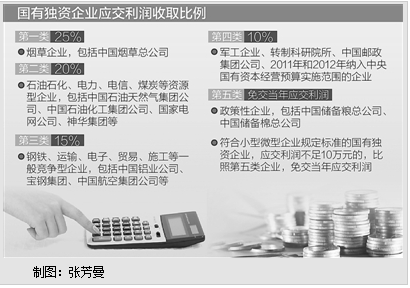 收取比例提高后,2014年预计收取中央企业税后利润1414.9亿元,比2013年执行数增加375.43亿元,增长36.1%。其中,第一类和第二类共15家企业,加起来上缴的税后利润将超过1000亿元,占了中央企业税后利润收取额的80%。