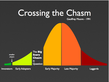 杰弗里•摩尔(Geoffrey A. Moore)在其《跨越鸿沟》一书中提到:“任何采取新模式或者新技术的企业,在其早期市场和主流市场之间存在着一条巨大的‘鸿沟’(参见下图)。能否顺利跨越鸿沟并进入主流市场,…决定了新模式和新技术的成败。”