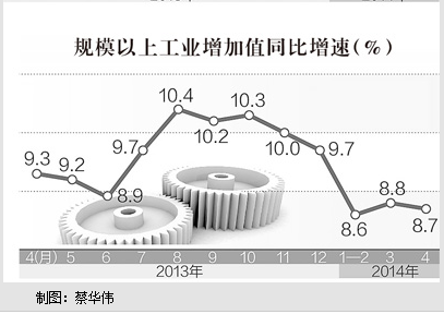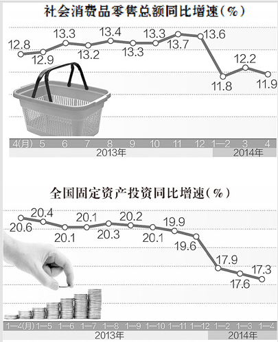 国家统计局5月13日发布的数据显示,4月份中国规模以上工业增加值增速比上月回落0.1个百分点;当月全国社会消费品零售总额增速比上月回落0.3个百分点;1至4月份全国固定资产投资增速比1至3月份回落0.3个百分点。跌幅虽小,但也引发了市场各方关注。