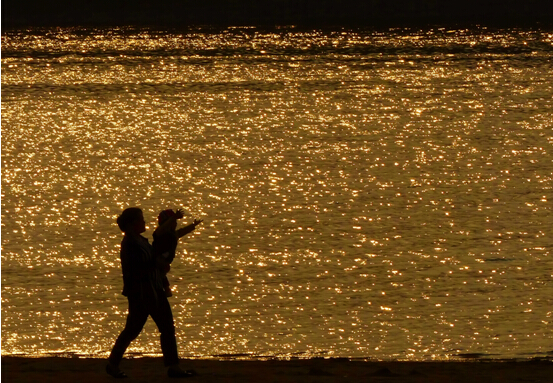夕阳撒向河面泛起的波澜金光闪闪,连孩子都不禁伸出双臂去拥抱夕阳的美丽。