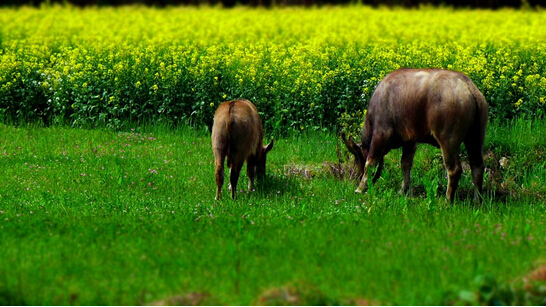 这张照片老牛带着小牛休闲吃草温馨之余更让人体会这片净土的休闲。