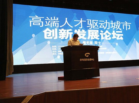 2014 年 5 月 26 日上午 9 点,由赤峰市人民政府、赤峰市人力资源和社会保障局主办,五甲万京信息科技创新园承办的“高端人才驱动城市创新发展论坛”在赤峰国际会展中心会议厅举行。中国工程院倪光南院士、赤峰市人力资源和社会保障局局长张子明、五甲万京集团董事长孙凯歌以及赤峰市相关单位领导等1500余人出席会议。倪光南院士作为论坛主讲人,为论坛做了“自主创新 ,发展国产智能终端操作系统”的主题演讲。