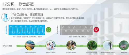 美的变频风扇,采用180°正弦波直流技术,电机运行持续平稳可靠,整机运行基本无噪音释放。因为按普通人的听觉,20—40分贝是安静,犹如轻声絮语;而0—20分贝属于很安静,几乎感觉不到。同时美的还特别设有26档无级调速技术、一键一旋钮遥控操作,给用户提供更多细致的选择。而最低90转/min的超低转速,更是带来极致静音的柔和风,更加适合老人和儿童使用。