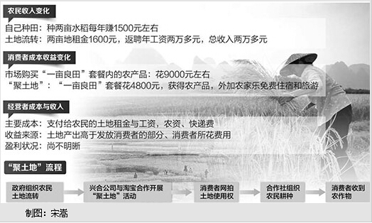 “聚土地”,是由安徽省绩溪县提供1000亩5A级良田,浙江省供销社兴合电子商务有限公司以及淘宝“聚划算”平台合作推出的“私家农场”定制活动。“私家农场”定制活动从3月13日开始,短短两天,绩溪县“聚土地”项目就认购完毕,超过3500名用户最终成了“地主”,销售额达到了228万元。