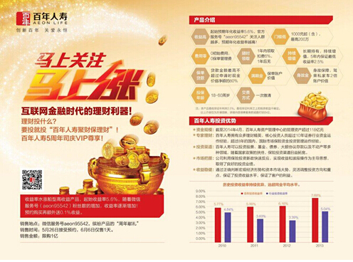 作为首款试水互联网保险的社交产品,百年人寿聚财保可谓一鸣惊人。与传统网销理财产品不同的是,其预期收益率完全交由投资者之手,只要关注官方微信服务号“aeon95542”的人数越多,预期年化收益率就水涨船高!