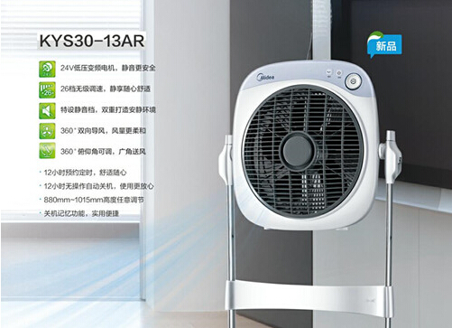 美的变频转页扇外观简洁大方,使用方便实用,充分体现了简约而不简单的设计理念。如变频家族今夏的新宠KYS30-13AR,拥有360°循环送风、360°俯仰角可调等多项功能。其360°俯仰角可随心调节,无极调节模式,就像家中的笔记本电脑,风叶可以随意停留在任何角度位置:可以沿着窗户的风向送风,对屋内的空气进行流通和换气;可由房间中央向上送风,均匀调节房间内的空气;可两个房间相互送风,增强循环两个房间之间的空气流通,保持温度的一致。