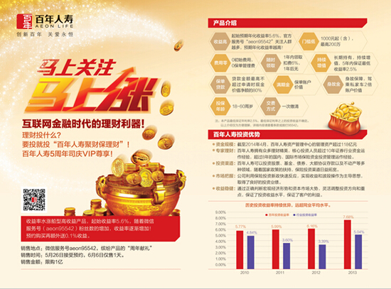 作为试水社交营销的五周年献礼之作,百年方面强调,聚财保更多是回馈新老客户,故采取“预约+限额”销售模式,只有关注官方微信服务号“aeon95542”并预约成功,才能参与2014年6月6日抢购,预约且最终购买成功的客户还将获得额外0.1%的收益回报。