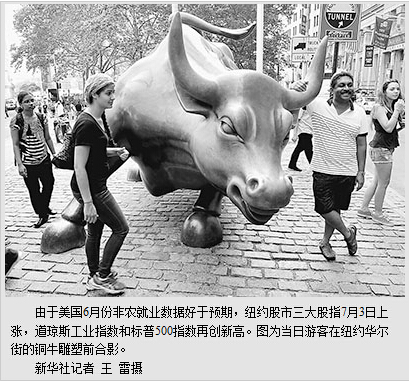 在就业数据利好的背景下,美国股市7月3日屡创新高。虽因独立日假期提前休市,但其中道琼斯工业指数仍实现历史上首次突破17000点,并与标准普尔500指数共同创下盘中与收盘新高。