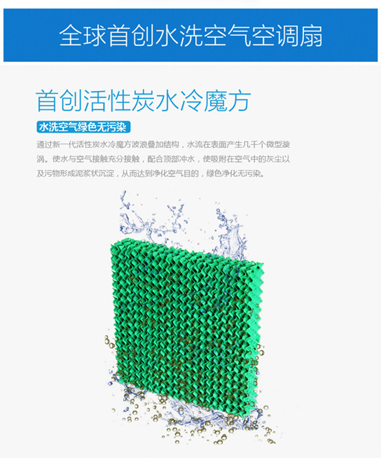 联创新一代空调扇的空气净化功能是一大亮点。它采用了联创科技首创的活性炭水冷魔方,新一代活性炭水冷魔方的波浪叠加结构会使水流在其表面产生数千个微型漩涡,让水与空气充分接触,配合顶部冲水使空气中的灰尘及污物形成泥浆状沉淀,从而达到祛除包括PM2.5在内的空气污染物的目的。