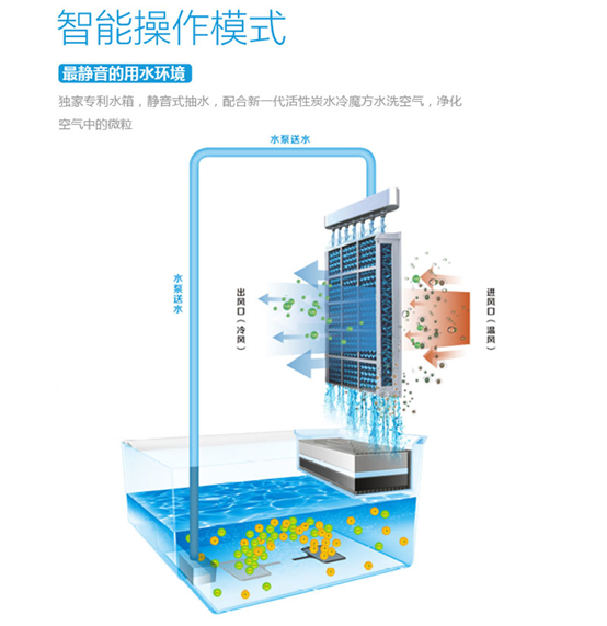 为了防止空调扇内部水循环系统的二次污染,经过新一代活性炭水冷魔方吸附空气污染物形成的污水,将通过独有的“净芯”完成三重净化,使净化水流中从空气中截留的杂质被隔离在水箱之外,从而保持水箱的洁净水循环。