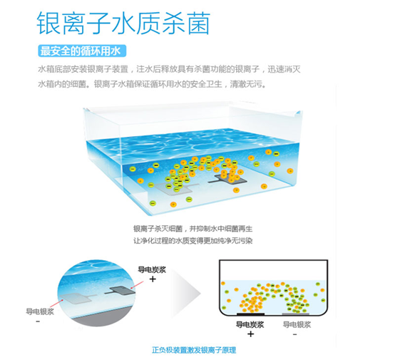 同时,联合新一代空调扇的水箱底部内置了银离子装置,在注水后会释放有杀菌功效的银离子,迅速消灭水箱内的细菌,保证水箱循环用水的安全卫生。