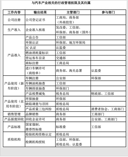 在投资领域,汽车产业长期规划、产业政策、投资项目审批等职能主要由国家发改委行使;在生产领域,各类车型产品的目录、油耗标准等主要由工信部管理;在经营领域,有关汽车企业国有资产管理职能由各级国资委行使;在供应链领域,生产企业所需零部件的进出口、流通等由商务部监管;在研发领域,汽车技术的研究与开发管理职能由科技部行使;至于消费和使用领域,也根据不同环节由财政部、商务部、公安部、交通部、技监部门、质检部门、工商部门、建设和城市规划部门、中国人民银行和中国保监会等分头管理。而且,几乎在每个领域,也并非一家做主,而是相互交叉;国家相关部门管,各地方政府相关部门也要管。