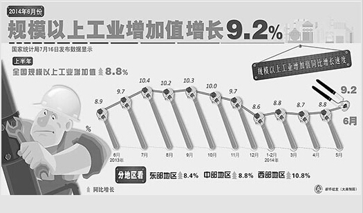 上半年,全国规模以上工业增加值按可比价格计算同比增长8.8%,增幅比一季度加快0.1个百分点。分地区看,东部地区增加值同比增长8.4%,中部地区增长8.8%,西部地区增长10.8%。分产品看,464种产品中有346种产品产量同比增长。上半年规模以上工业企业产销率达到97.5%,与上年同期持平。规模以上工业企业实现出口交货值56143亿元,同比增长5.3%。1—5月份,全国规模以上工业企业实现利润22764亿元,同比增长9.8%。